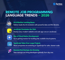 With so many options available, choosing the right one can feel confusing. In this programming language guide for remote work, we’ll break down the best programming languages for remote jobs, explore the remote job programming language trends 2026, and help you choose the right language based on your career goals.